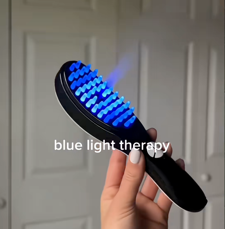 Red light stimulates collagen production and strengthens hair follicles for thicker growth. Blue light balances oil production, reduces scalp irritation, and helps keep follicles clear.